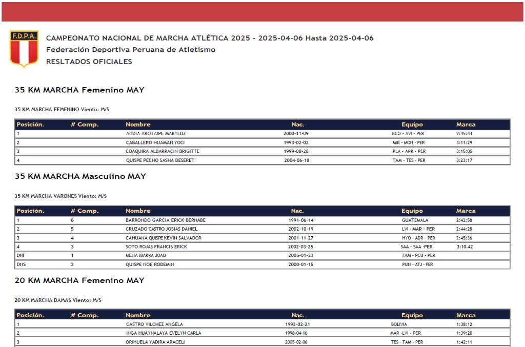 CAMPEONATO NACIONAL DE MARCHA ATLÉTICA 2025 – 2025-04-06 Hasta 2025-04-06 Federación Deportiva Peruana de Atletismo RESULTADOS OFICIALES