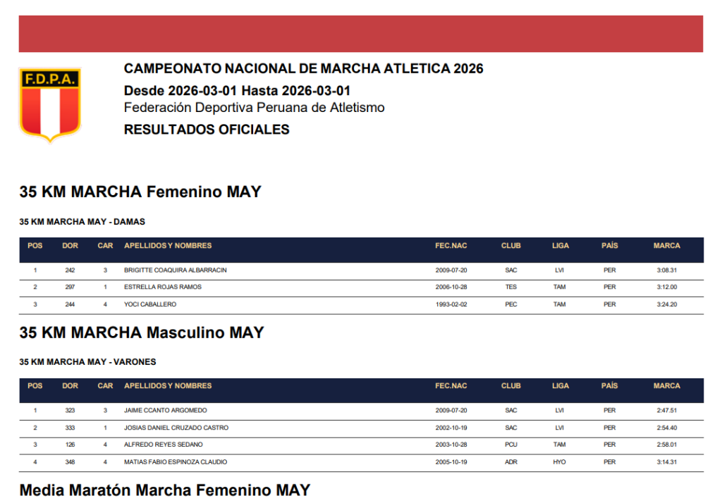 Desde 2026-03-01 Hasta 2026-03-01 Federación Deportiva Peruana de Atletismo RESULTADOS OFICIALES