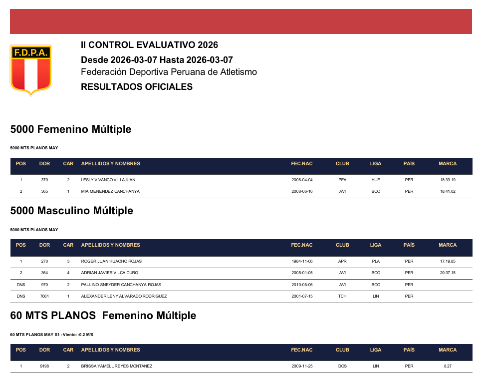 Desde 2026-03-07 Hasta 2026-03-07 Federación Deportiva Peruana de Atletismo RESULTADOS OFICIALES