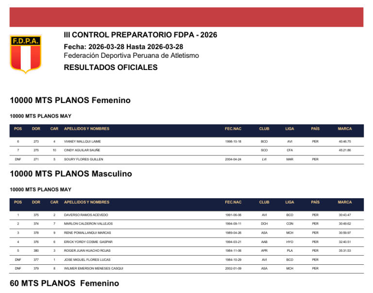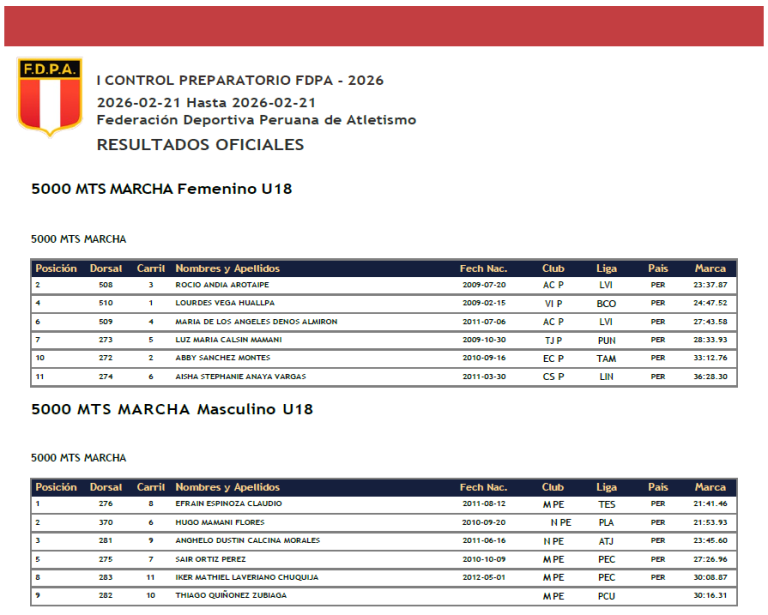 Desde 2026-03-01 Hasta 2026-03-01 Federación Deportiva Peruana de Atletismo RESULTADOS OFICIALES