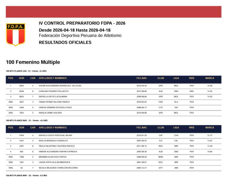 IV CONTROL PREPARATORIO FDPA – 2026Desde 2026-04-18 Hasta 2026-04-18 RESULTADOS OFICIALES
