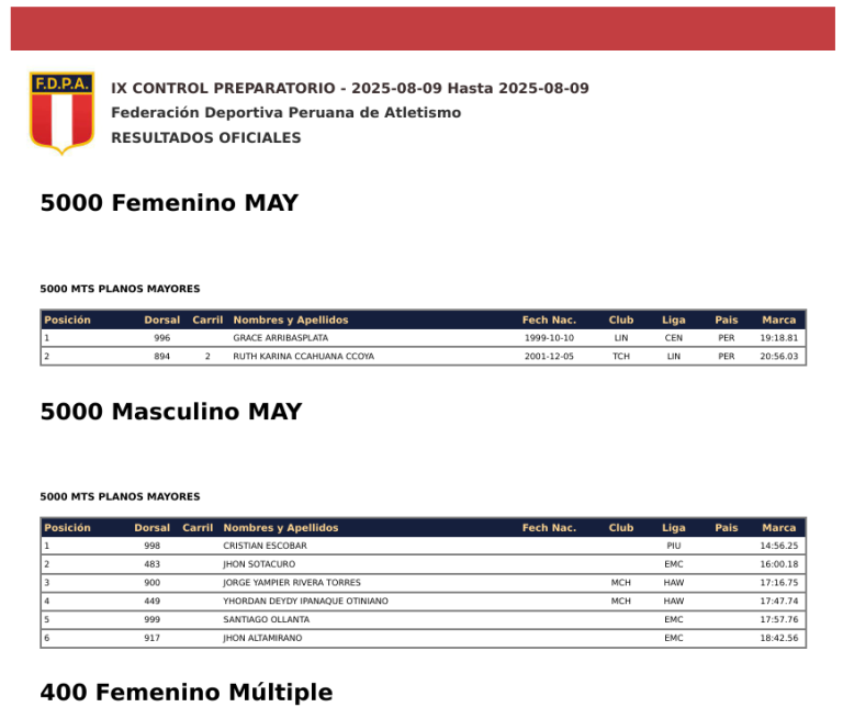 IX CONTROL PREPARATORIO – 2025-08-09 Hasta 2025-08-09 Federación Deportiva Peruana de Atletismo RESULTADOS OFICIALES