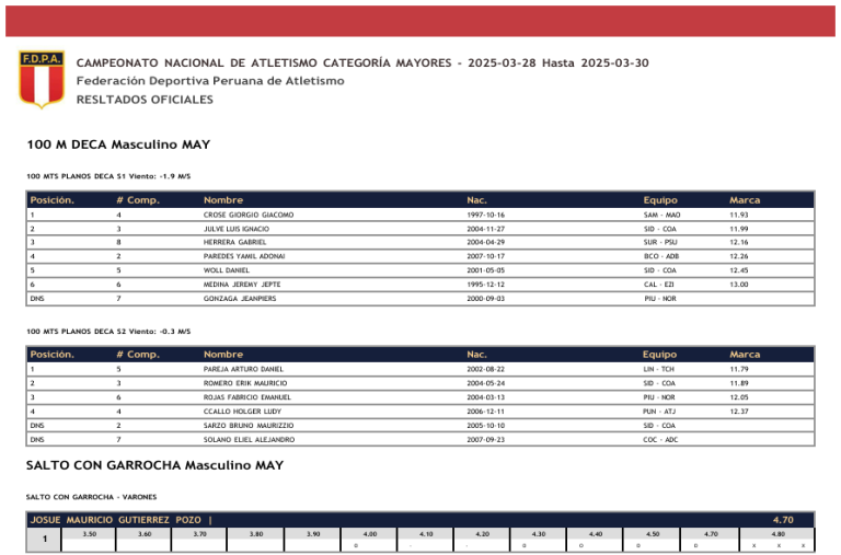 CAMPEONATO NACIONAL DE ATLETISMO CATEGORÍA MAYORES – 2025-03-28 Hasta 2025-03-30 Federación Deportiva Peruana de Atletismo RESULTADOS OFICIALES
