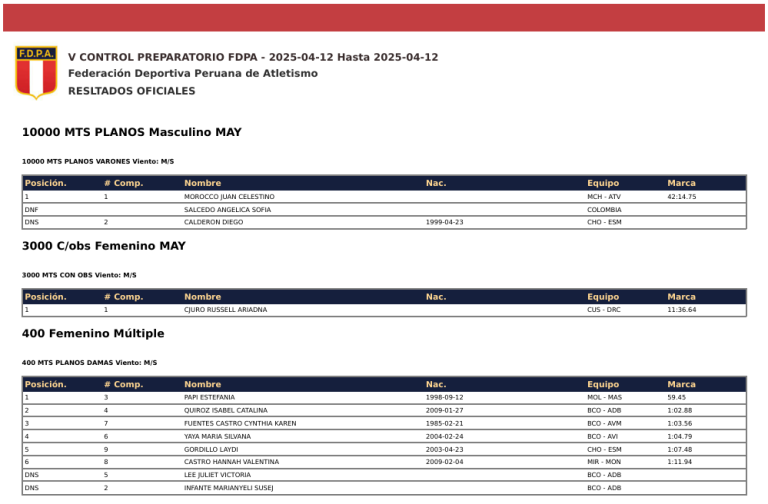 V CONTROL PREPARATORIO FDPA – 2025-04-12 Hasta 2025-04-12 Federación Deportiva Peruana de Atletismo RESULTADOS OFICIALES